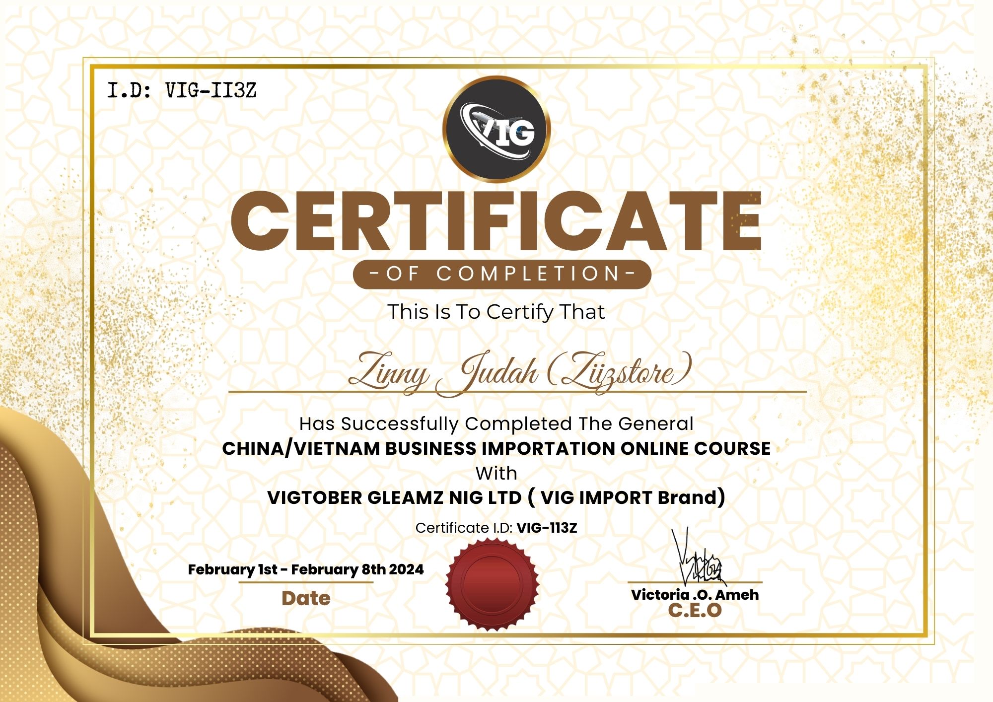 Congratulation on your Successful completion of the CHINA/VIETNAM Business Importation Class With VIGORBERG GLEAMZ NIG LTD.Kindly Download Your E-Certificate below. Thank You. Victoria O. AmehC.E.O Your Certificate 113ZDownload