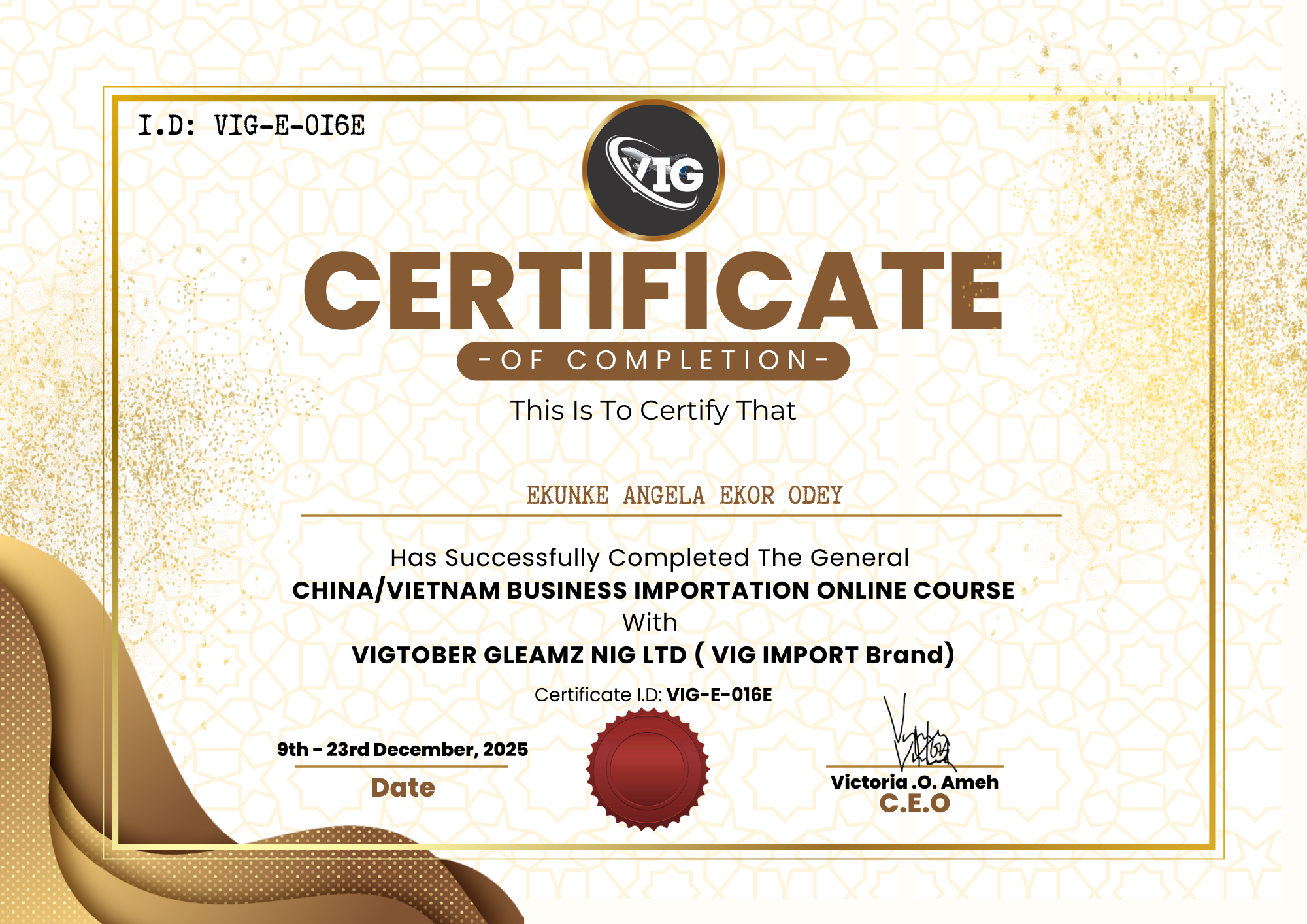 Congratulation on your Successful completion of the CHINA/VIETNAM Business Importation Class With VIGORBERG GLEAMZ NIG LTD.Kindly Download Your E-Certificate below. Thank You. Victoria O. AmehC.E.O Your Certificate VIG-E-016EDownload