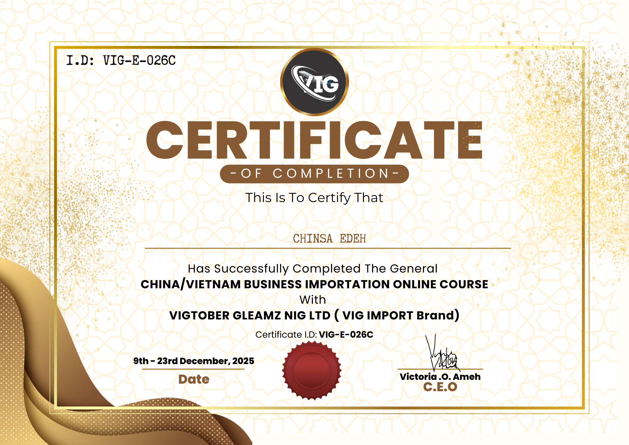 Congratulation on your Successful completion of the CHINA/VIETNAM Business Importation Class With VIGORBERG GLEAMZ NIG LTD.
