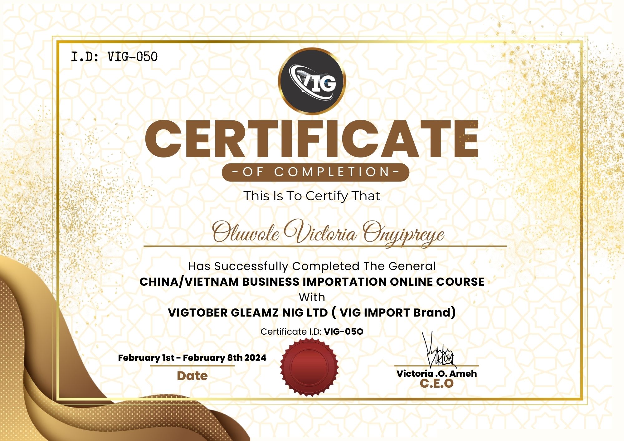 Congratulation on your Successful completion of the CHINA/VIETNAM Business Importation Class With VIGORBERG GLEAMZ NIG LTD.Kindly Download Your E-Certificate below. Thank You. Victoria O. AmehC.E.O Your Certificate 05ODownload