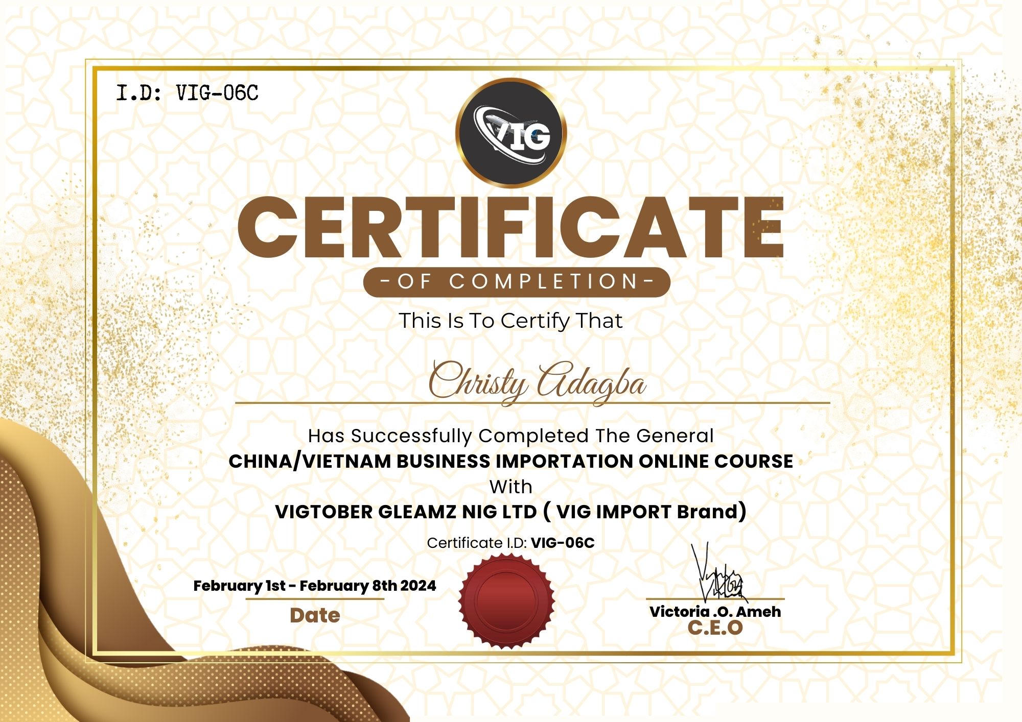 Congratulation on your Successful completion of the CHINA/VIETNAM Business Importation Class With VIGORBERG GLEAMZ NIG LTD.Kindly Download Your E-Certificate below. Thank You. Victoria O. AmehC.E.O Your Certificate 06CDownload